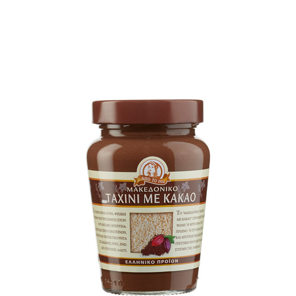 Tahini (Taxini) mit Kakao von Haitoglou: Sesampaste mit Kakao aus Makedonien. Tahini oder auch Taxini ist eine Sesamspezialität aus gemahlenen Sesamsamen. Seit 1924 stellt die Firma Haitoglou aus Kalochori (bei Thessaloniki) in Nordgriechenland Feinkostprodukte aus Sesam her. Sesamölablagerungen im Glas sind natürlichen Ursprungs und völlig normal. Rühren Sie das Produkt nach dem Öffnen gut durch. Tahini mit Kakao eignet sich zur Zubereitung von Dipps und Soßen, als Brotaufstrich und zur Herstellung von Süßspeisen.